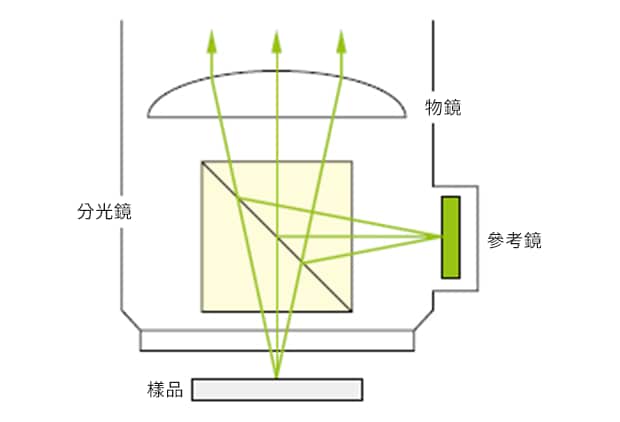 使用光學(xué)干涉儀時(shí),高度解析度不取決於物鏡的倍率,因?yàn)榧词刮镧R的景深很大,代表干涉條紋強(qiáng)度的複合波形也可以透過計(jì)算精確地重現(xiàn)。 由於光的波長(zhǎng)是固定的,因此光的干涉條紋會(huì)以固定的間隔出現(xiàn)。這意味著,如果預(yù)先知道所使用的波長(zhǎng),就可以計(jì)算出干涉條紋強(qiáng)度的複合波形會(huì)是什麼樣子。 接著,透過從固定間隔擷取的干涉強(qiáng)度重現(xiàn)複合波形圖,並將重現(xiàn)的複合波形分離進(jìn)行處理,進(jìn)而實(shí)現(xiàn)高解析度量測(cè)。