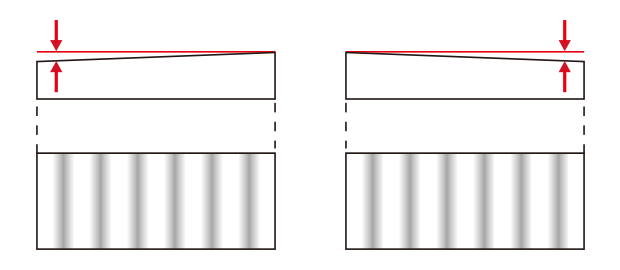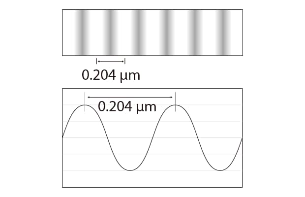 例如,使用408 nm的光源時(shí),干涉條紋的間距(波長(zhǎng))為0.204 μm。 此數(shù)值代表量測(cè)表面的高度差。 由於波形圖中波峰到波峰的高度差為0.204 μm,因此透過將波峰之間的波形圖分割為2000個(gè)區(qū)段,即可實(shí)現(xiàn)0.1 nm的解析度。 光學(xué)干涉儀透過量測(cè)規(guī)則干涉條紋的明暗變化來量測(cè)高度的變化。