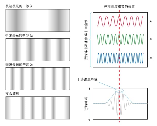 使用白光光源時(shí),在物鏡焦點(diǎn)處的量測(cè)表面上,干涉條紋會(huì)變得最強(qiáng),而遠(yuǎn)離焦點(diǎn)時(shí)則會(huì)消失。透過疊加不同波長(zhǎng)的干涉條紋所產(chǎn)生的複合波形,可以偵測(cè)到干涉強(qiáng)度的峰值。