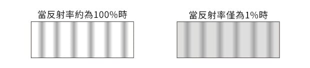 如果參考表面的反射率為100%,且量測(cè)表面的反射率也約為100%,則會(huì)出現(xiàn)清晰的干涉條紋。 然而,如果量測(cè)表面的反射率僅為1%,對(duì)比度就沒有那麼清晰。
