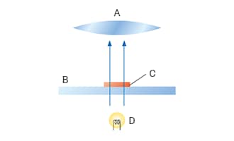 A:鏡頭 B:玻璃板 C:目標(biāo)物 D:光源