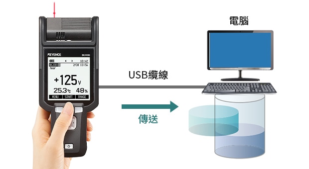 量測到的數(shù)據(jù)可記錄在主體的內(nèi)部緩衝記憶體,最多記憶100組數(shù)據(jù)。記錄的數(shù)據(jù)可用USB纜線傳送至電腦,以CSV數(shù)據(jù)儲存。