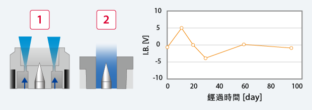 A.C.A.B 採用Clean Air Barrier進一步進化而來的Advanced Clean Air Barrier系統(tǒng)??刂乒┙o的CDA流動,在電極周邊形成「層流」。透過大幅減少導(dǎo)致靜電消除性能退化的電極前端「附著物」,實現(xiàn)減少維護業(yè)務(wù)的目的。