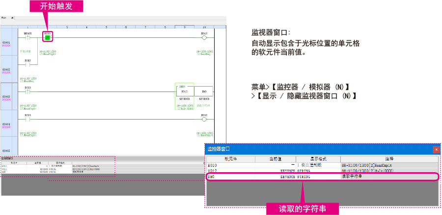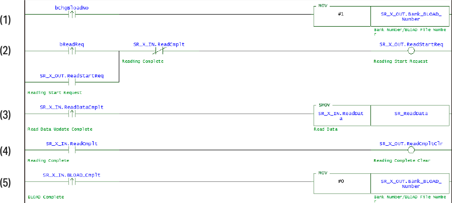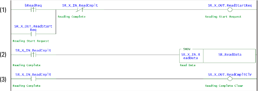 在此程式範(fàn)例中,使用下列 SR-X 系列 裝置指定,讀碼器會被指示以 1 號庫的設(shè)定開始讀取,讀取字串會儲存在 SR_ReadData 中。